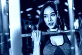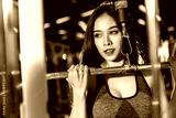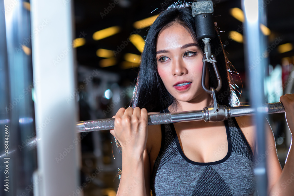Fitness Asian women performing doing exercises training with rowing machine (Seat Cable Rows Machine) in sport gym interior and fitness health club with sports exercise equipment Gym background.