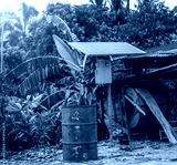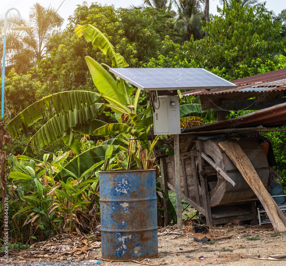 Solar panel in a rural houses area and old oil barrels are ready to recycle Industrial,Agro-industry of household Rural style in Thailand, Alternative energy concept