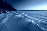Snow drifts along frozen shoreline of Torch Lake in Northern Michigan.