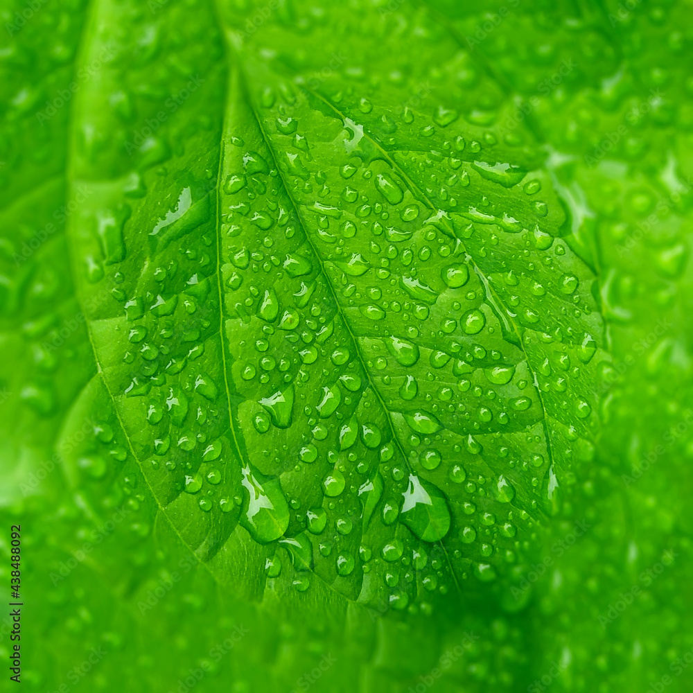 Drops on green leaf blurry, macro image of wet leaf element in nature