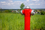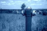 hydrant to connect water on the field, city far in the background. The concept of connections needed in agriculture or in the construction of houses outside the city
