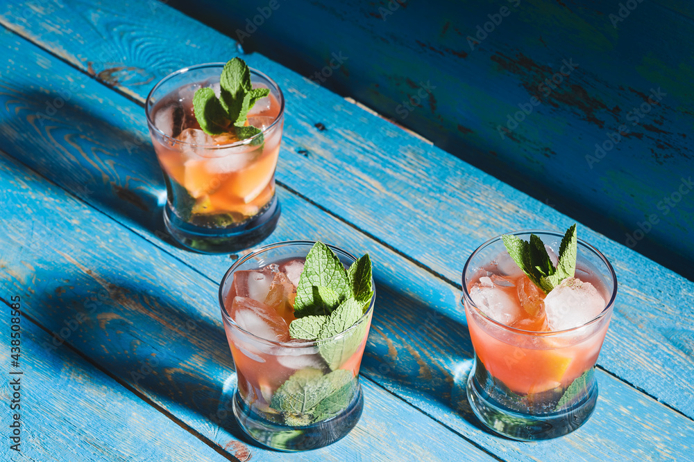 Ice cold homemade lemon juice drinks with fresh strawberries, lemonade
