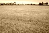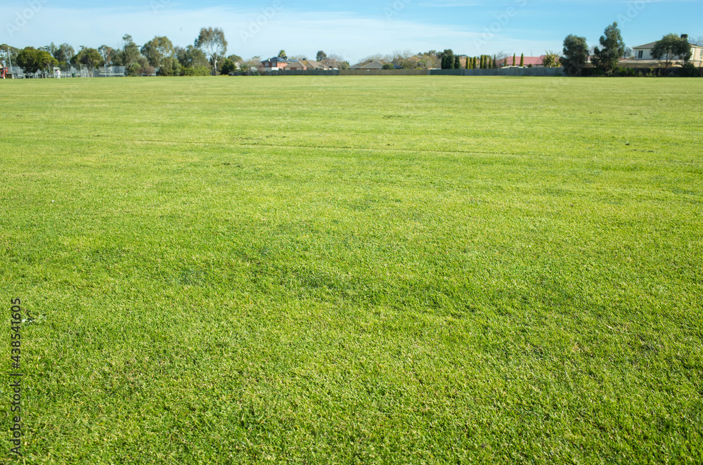 Background texture of a large public local park with green and healthy grass and with some trees and residential houses in the distance. Melbourne, VIC Australia
