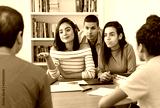 Gruppe internationaler Studenten diskutiert über Projekt
