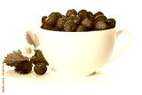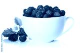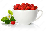 Berry wild strawberry in cup with green leaf and flower. Fruity still life. Healthy eating. Isolated on white background.