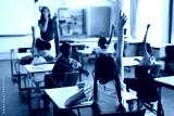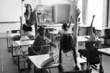 Rear view of students raising their hands while sitting on their desk in the class at school
