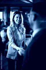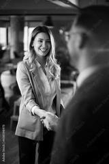 Businesswoman offering hand for handshake. Businessman and businesswoman handshake.