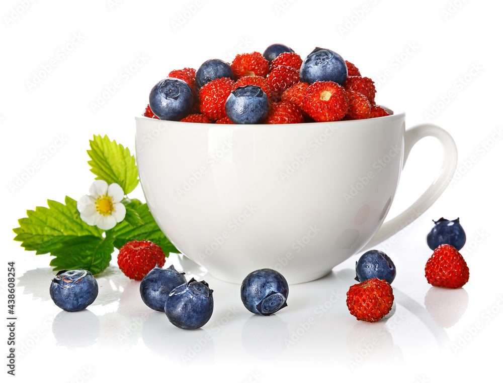 Berry wild strawberry and blueberry in cup with green leaf and flower. Fruity still life. Healthy eating. Isolated on white background.