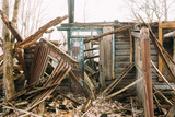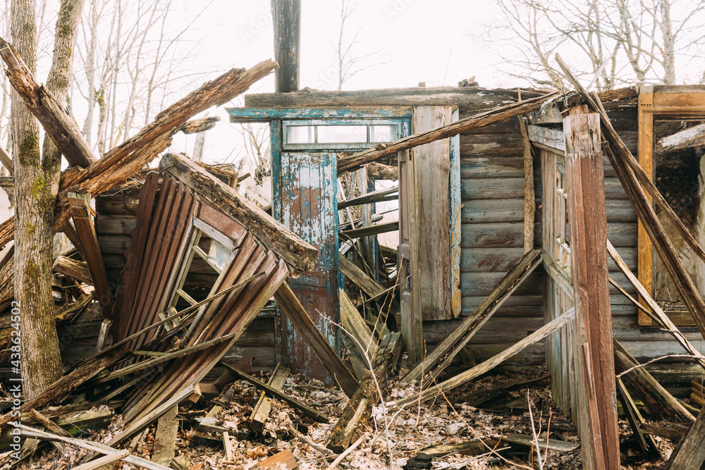 Abandoned Ruined Old Wooden Village House In Chernobyl Resettlement Zone. Belarus. Chornobyl Catastrophe Disasters. Dilapidated House In Belarusian Village. Whole Villages Must Be Disposed