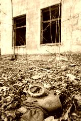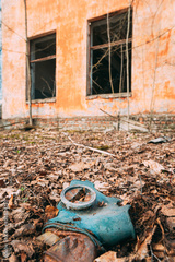 Gasmask Near Abandoned Ruined Old Village School Building In Chernobyl Resettlement Zone. Belarus. Chornobyl Catastrophe Disasters. Dilapidated House In Belarusian Village. Whole Villages Must Be