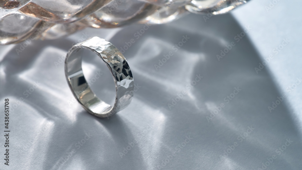 Elegant silver engagement ring standing on gray