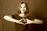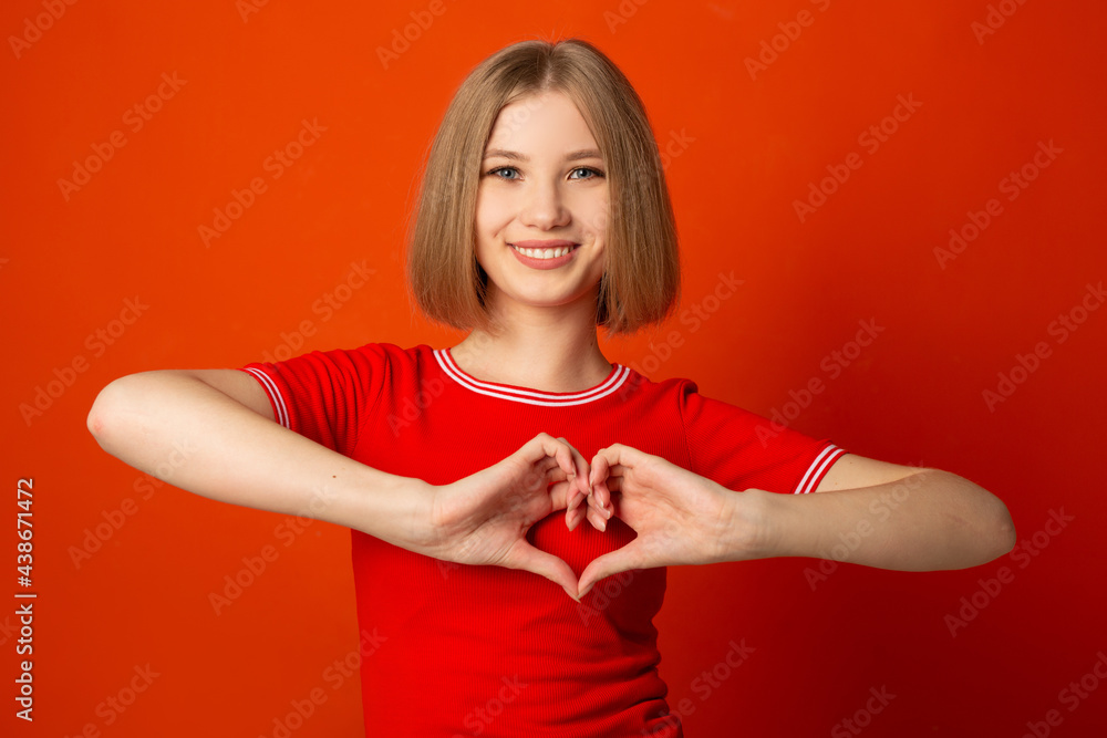 cheerful young woman with heart hand gesture