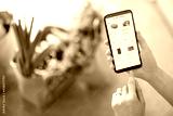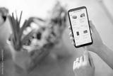 Holding phone with running e-shop application and bags full of fresh food on the background. Shopping groceries online concept