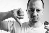 The fall and collapse of the course of the crypto currency. Concept of depreciation of cryptocurrency. The man is shocked by the fall in the price of bitcoin.