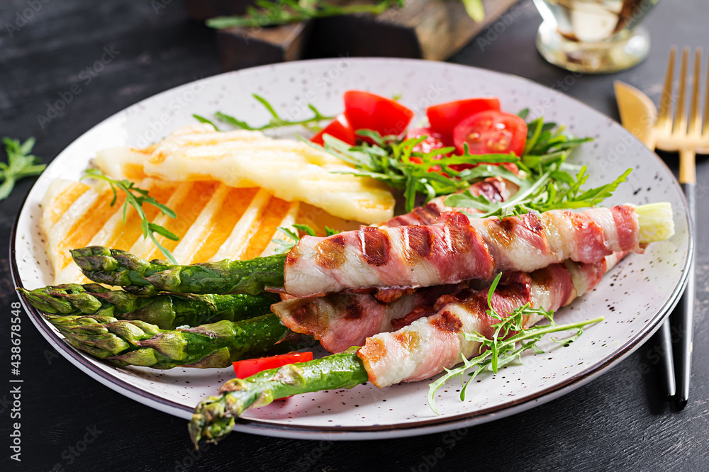 Grilled halloumi cheese salad with tomatoes and asparagus in strips of bacon on plate on dark background. Healthy food.