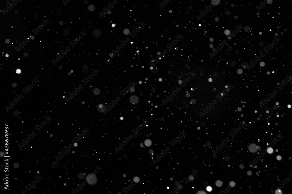 Bokeh of white snow on a black background. Snowfall - design element.