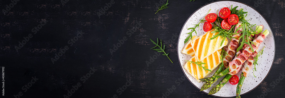 Grilled halloumi cheese salad with tomatoes and asparagus in strips of bacon on plate on dark background. Healthy food. Top view, above