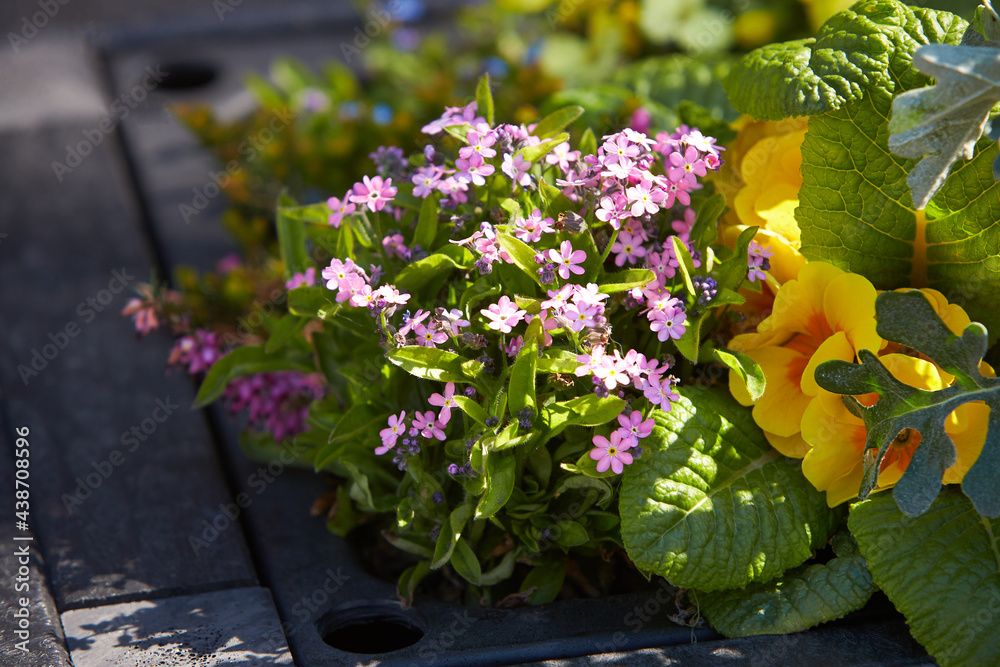 Blooming bright street bouquet flowers close-up, green summer field. Nature, plants, botany, gardening.