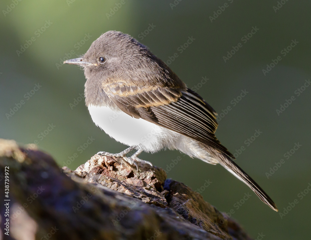 Juvenile Black Phoebe perched on a rock. Santa Clara County, California, USA.