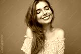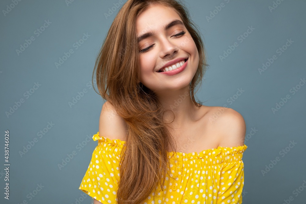 Closeup photo of young smiling cute beautiful dark blonde woman with sincere emotions isolated on background wall with copy space wearing stylish summer yellow dress. Positive concept