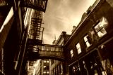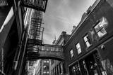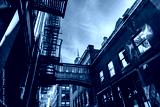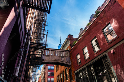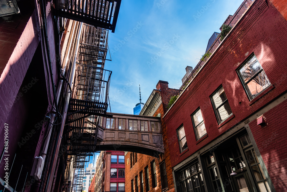 Low angle view of bridge on Staple Street in Tribeca in New York. Picturesque cityscape in Lower Manhattan