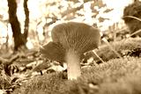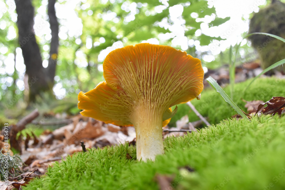 Cantharellus cibarius (commonly known as the chanterelle, golden chanterelle or girolle) Fungus in the natural environment. Mushroom in forest