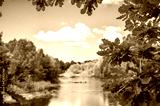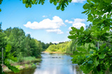 Summer Landscape. focus on fresh green oak foliage. forest River And Clouds On The Blue Sky. Nature landscape photography