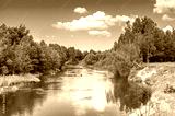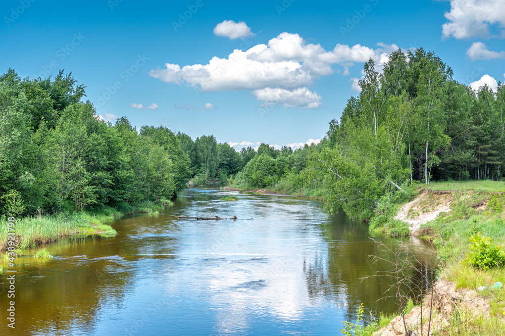 Calm river flowing gently through woodland landscape. Landscape With Forest On Coast Of river, Pond Or River At Summer
