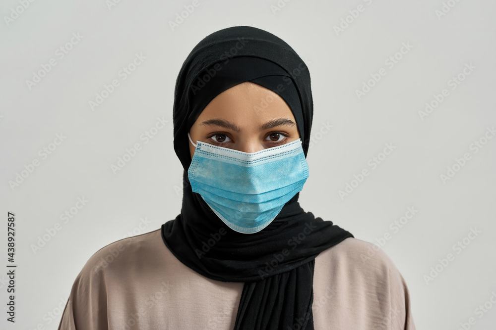 Portrait of young arabian girl in hijab and mask