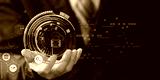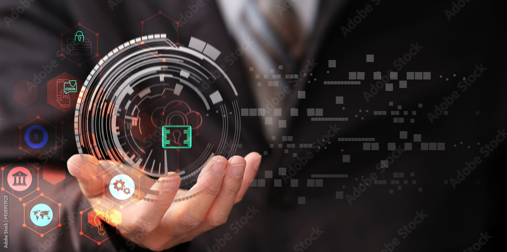 Businessman holding padlock protecting business and financial data with virtual network connection, Technology and digital marketing, Financial and banking
