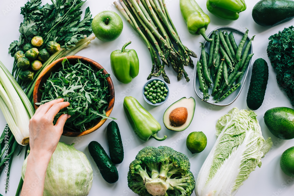 Woman hands taking fresh arugula from wooden bowl on table with fresh vegetables, healthy nutrition concept.