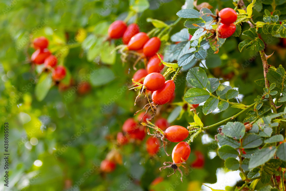 Dog rose fruits (Rosa canina) in nature. Red rose hips on bushes with blurred background