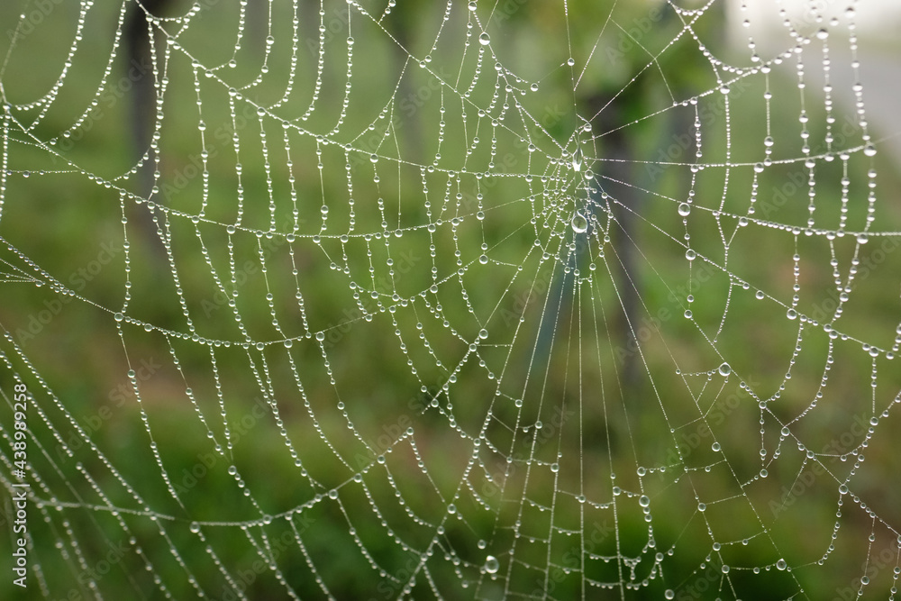 Spiderweb with dew water drops in green
