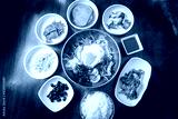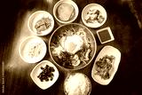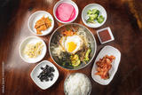 Overhead Korean Bibimbap Rice and Mixed Vegetable Dish with Sides