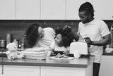 African American family with girl child are prepared sandwiches in the kitchen together, toasting bread and spending fun time together