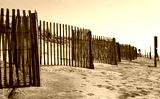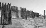 Wooden picket fences in front of the sand dunes on the beaches of Fire Island New York