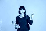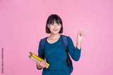 Asian Student cute girl happy smiling smart holding books bag pack learning research studying information communication languages pink isolated background school college university academic education