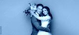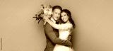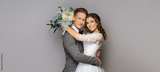 Wedding Couple, Beautiful Bride in White Dress with long train tail, Elegant Groom - Romantic Studio Portrait