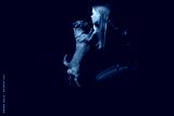 Studio portrait of beautiful young woman kissing her dog. Dog is standing on two legs.