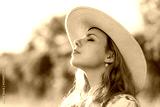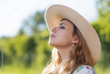 Side view of sunbathing beautiful young woman with straw hat. Horizontally.