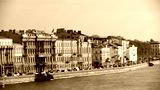 Embankment of the city of Saint Petersburg, Russia. Evening city in the sunset sunlight. Canal of the old beautiful city. Cars moving on road city traffic.