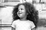 Outdoor portrait of a curly african american girl on a background of old wooden door.