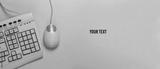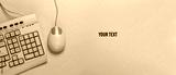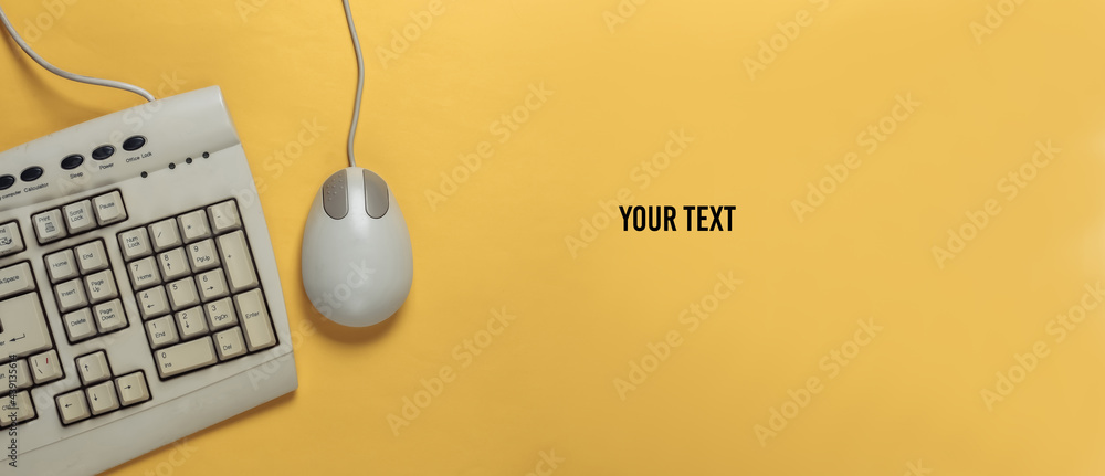 Old-fashioned retro keyboard and pc mouse on yellow background. Retro computer. Top view. Copy space