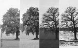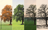 Abstract image of lonely tree in winter without leaves on snow, in spring without leaves on grass, in summer on grass with green foliage and autumn with red-yellow leaves as symbol of four seasons