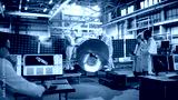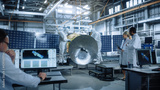 Team of Engineers Working on Satellite Construction, Use Tablet Computer Talk about Data. Aerospace Spaceship Manufacturing Facility: Team of Scientists Building Spacecraft for Space Exploration
