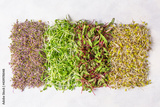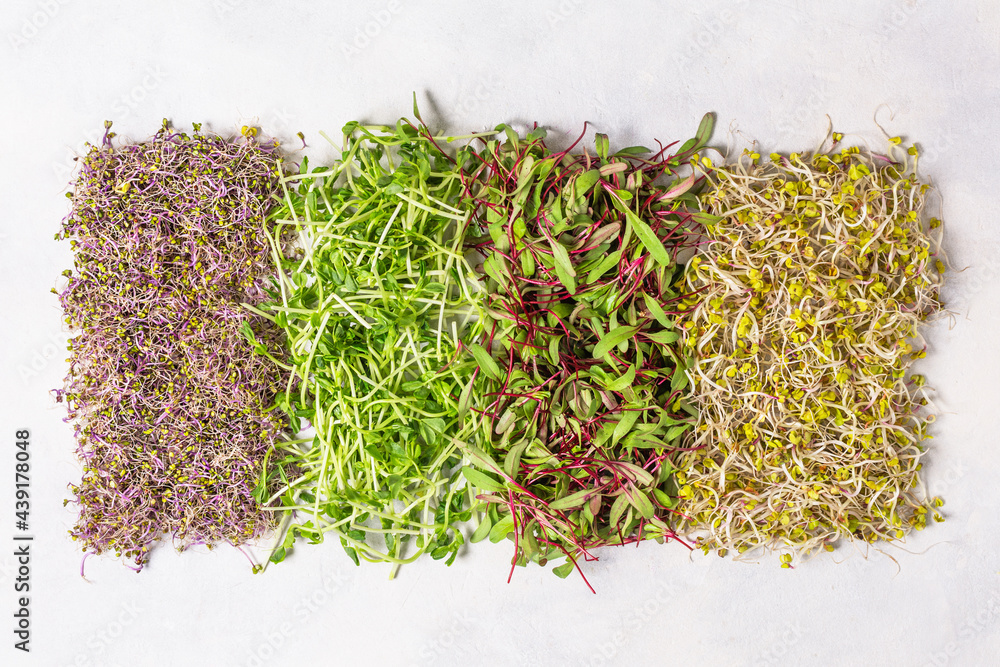 Mix of various sprouts on white background top view. Sprouted seeds. Healthy eating, detoxification.