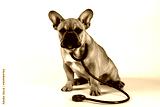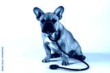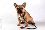 Cute french bulldog puppy sits on a white background. The dog is wearing a stethoscope. Eye contact. The concept of animal treatment, veterinary medicine. Copy space.
