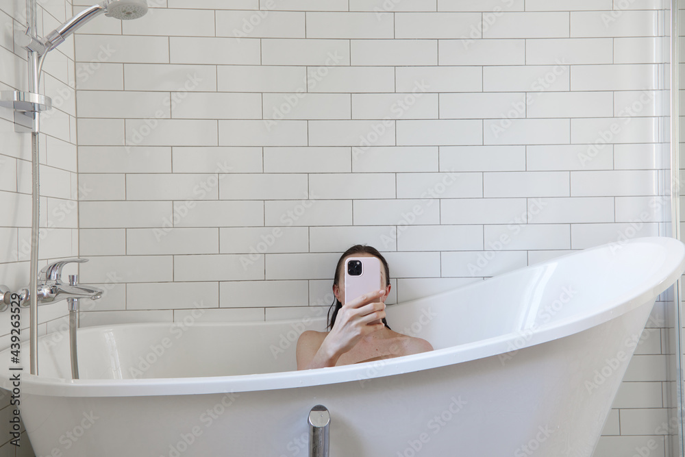Unrecognizable female covering face with mobile phone while taking bath in white bathtub and surfing internet during daily hygiene routine at home