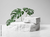 minimal white podium display for cosmetic product presentation, pedestal or platform background