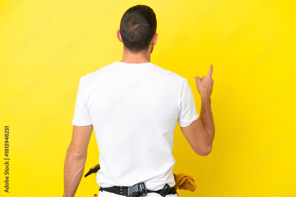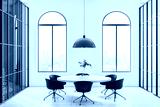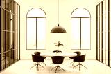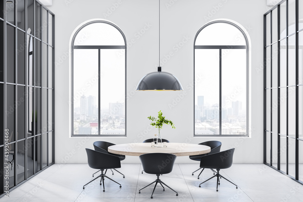 Stylish monochrome style room with light wooden round table and black chairs around on ceramic tales floor, city view from arched windows and modern black vintage lamp from top. 3D rendering.